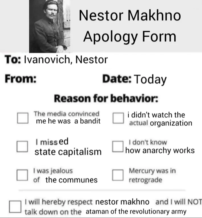 Context: Nestor Makhno was a Ukrainian anarchist revolutionary during the Russian Civil War. He led the Revolutionary Insurgent Army of Ukraine, fighting for anarchist self-rule. Makhno supported free soviets, peasant land control, and the abolition of the state. After cooperating militarily, the Bolsheviks betrayed his movement, crushed it, and forced him into exile.
