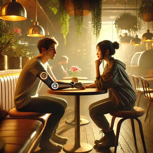 IMAGINE: In 2124, androids and humans coexist seamlessly. You’re sitting in a cozy cafe, watching two people have an intimate, almost lovers' conversation. One of them has a small glowing emblem on their wrist, an unmistakable sign that they are an android, required by law. Despite this, their connection feels real, deep, and natural, as if they’ve been in each other’s lives for years. The emblem is the only thing separating them from being human, but the conversation, full of quiet affection, feels indistinguishable from any other intimate exchange.