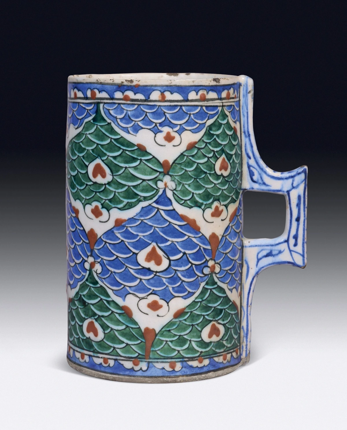 Fish-scale tankard, glazed pottery, Ottoman Empire (Turkiye), late 16th century AD