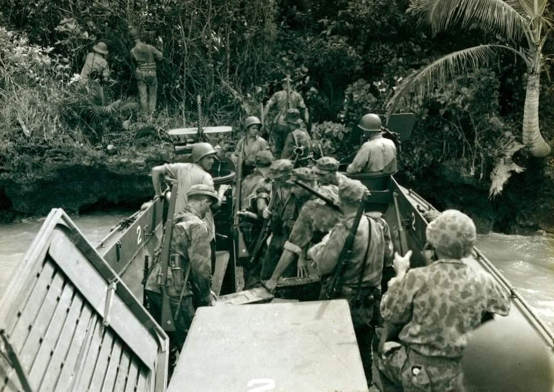 Allied troops crossing a river, Nissan Island, Pacific Theatre, WW2, early 1944
