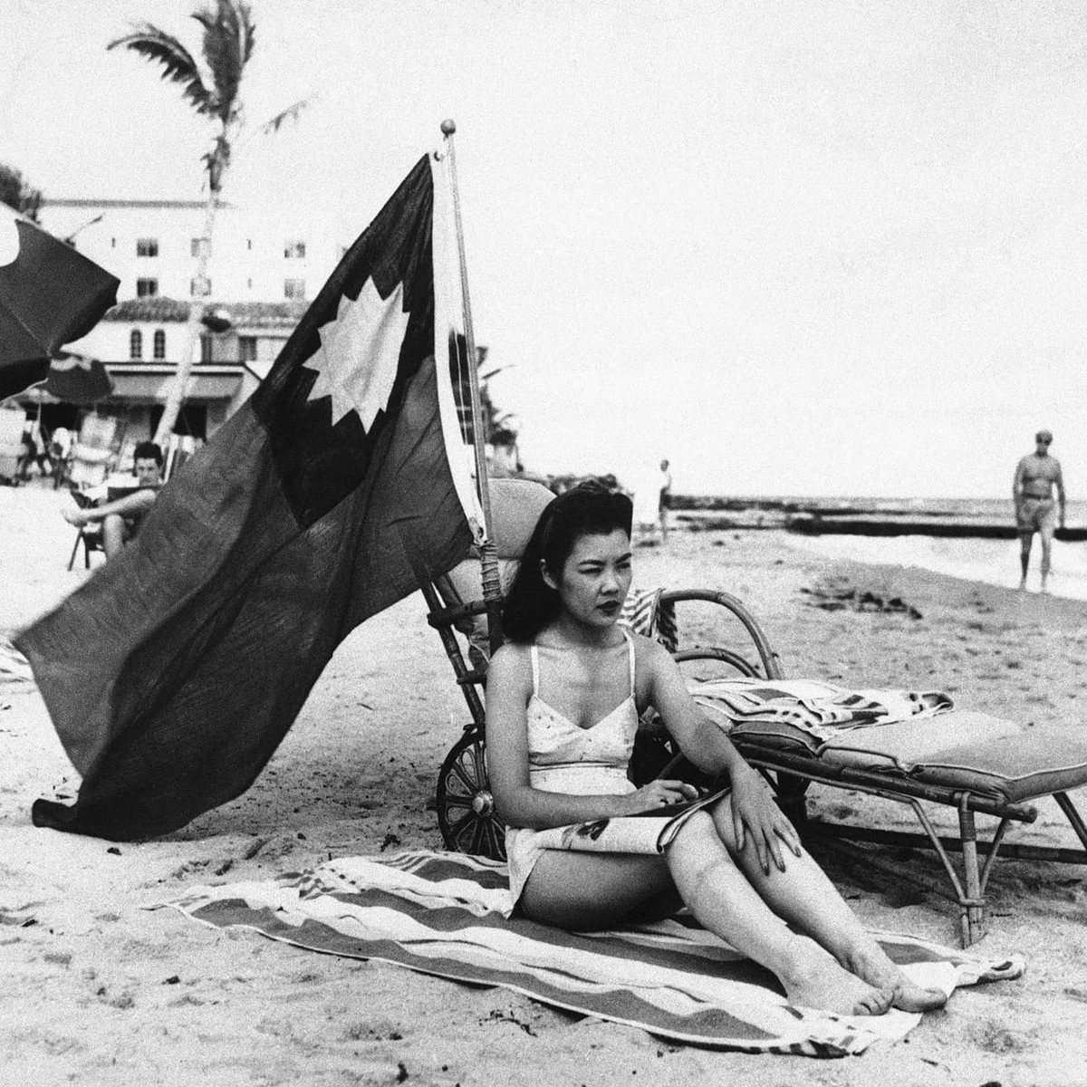 Ruth Lee, a Chinese-American woman, flying the flag of China while at the beach to avoid being mistaken for Japanese, Miami, USA, WW2, December 15, 1941