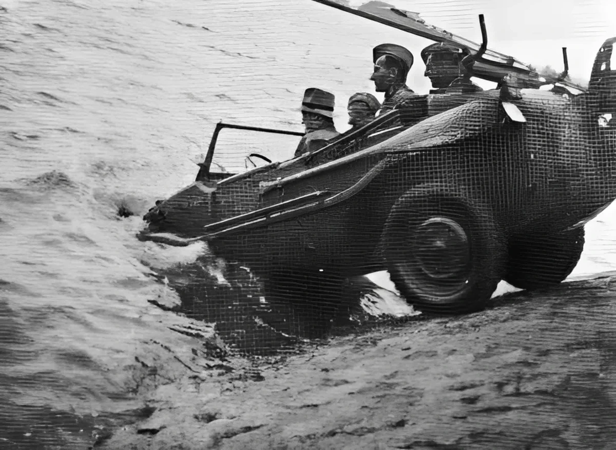 Nazi Schwimmwagen entering water, WW2, 1942