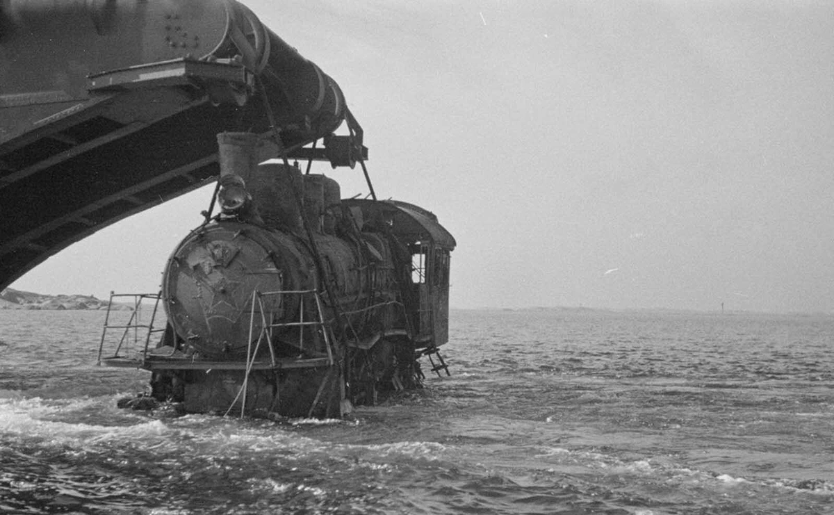 Locomotive being retrieved from the sea, Finland, Continuation War, WW2, early 1940s