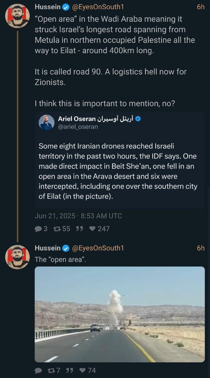 VIDEO: With Israeli air defense disrupted, individual Iranian drones can operate freelyπ: https://files.catbox.moe/jl44us.mp4Iran can launch the same kind of air war that Russia has launched against Ukraine, hitting water and electricity infrastructure on the cheap. Zionists will attempt to hide this so they can kill more civilians.Video source: https://t.me/me_observer_TG/559283@palestine@lemmy.ml #palestine #iran #news #seenfootage #warblog