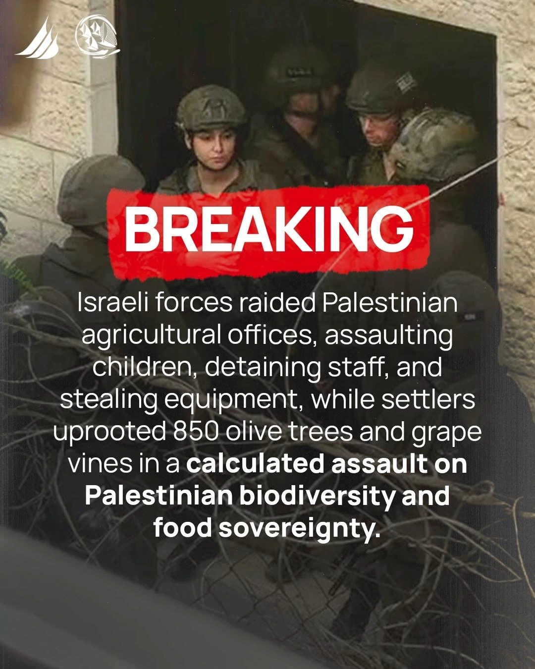 Israeli forces raided Palestinian agricultural offices, assaulting children, detaining staff, and stealing equipment, while settlers uprooted 850 olive trees and grape vines in a calculated assault on Palestinian biodiversity and food sovereignty.