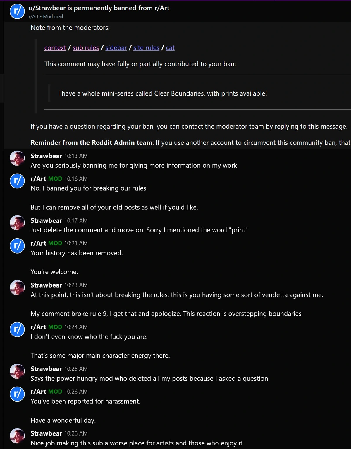 Late Wednesday, all human moderators of Reddit’s r/art subreddit quit en masse, leaving the 30-million-member community locked and bot-run with no new posts allowed. The trigger was Clay’s ban under Rule 9, which strictly prohibits any mention of sales, commissions, or prints to keep focus on art critique. Clay shared screenshots of the curt mod response and his locked view of the pinned resignation notice, calling it absurd while selling prints of the moment. The episode exposed ongoing frustrations in online art communities over rigid rules and moderator decisions.