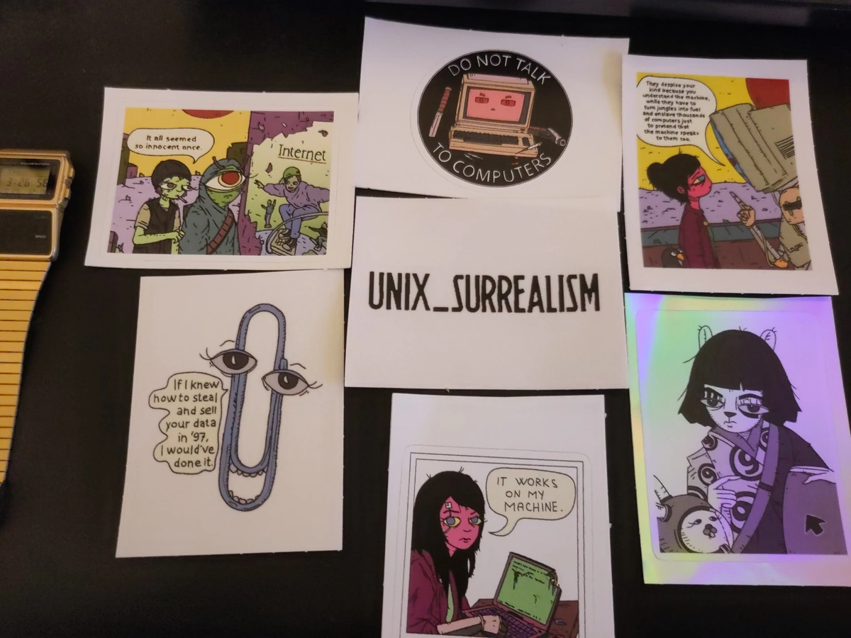 Our local Linux user group made a group order (Thanks Mark!) of unix surrealism stickers.