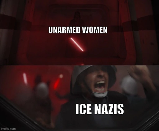 The meme is making fun of ICE agents for apparently being such cowards that they are afraid of an unarmed woman, seeing her as a threat on the level of Darth Vader.