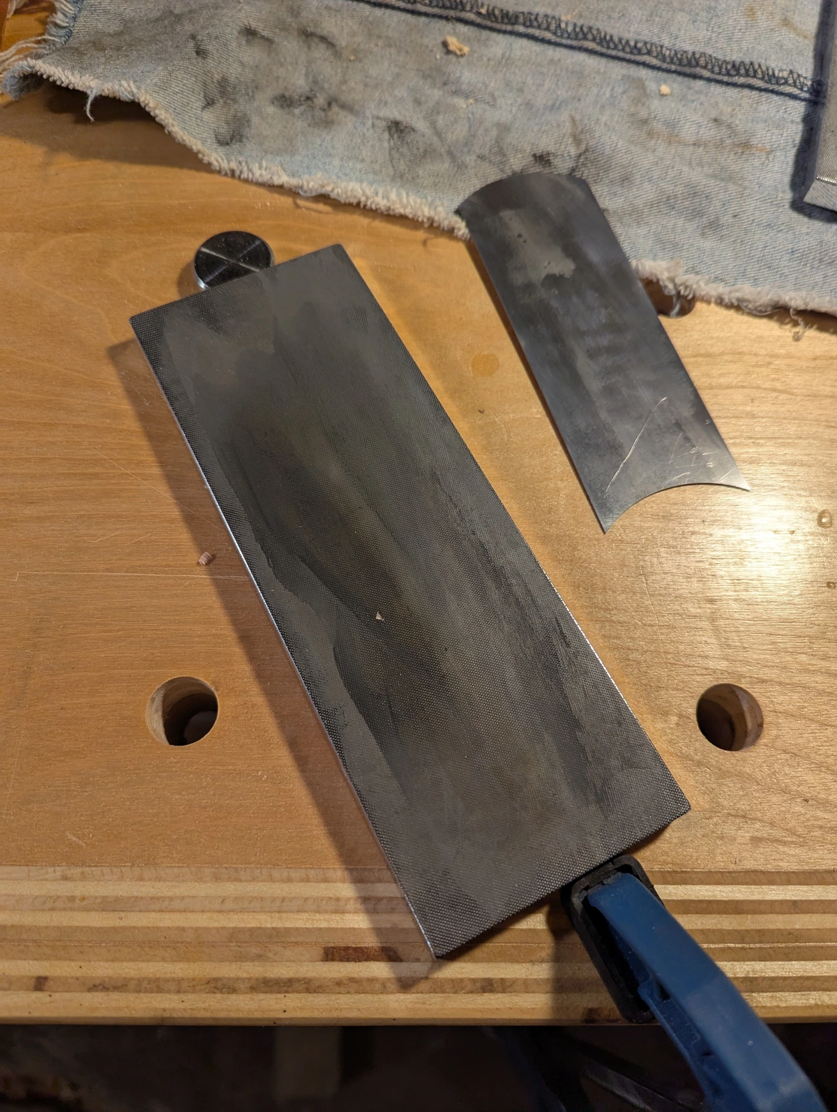 The third step, burnishing the edge, at a slight angle towards the face “turns the burr upwards”. The SEM clearly shows a blade-like bevel has been formed, perpendicular to the card face. However, rather than simply turning the burr, metal has been reformed, and the burr has buckled rather than rotating. Additionally, the burnishing rod has honed the side of the bevel, removing metal just as a honing rod removes metal to restore a knife edge.